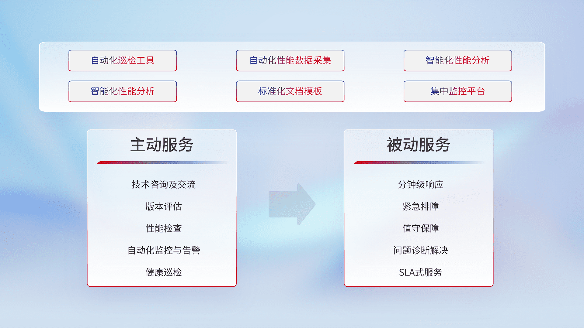 智能化工具和标准化文档,,,,保障服务质量,,,,提供主动服务(包含技术咨询、、版本评估、、性能检查、、自动化监控与告警、、健康巡检)和被动服务包含(分钟级响应、、紧急排障、、值守保障、、、、问题诊断解决、、、、SLA服务)。。。。